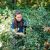 with a garden rake in hand,