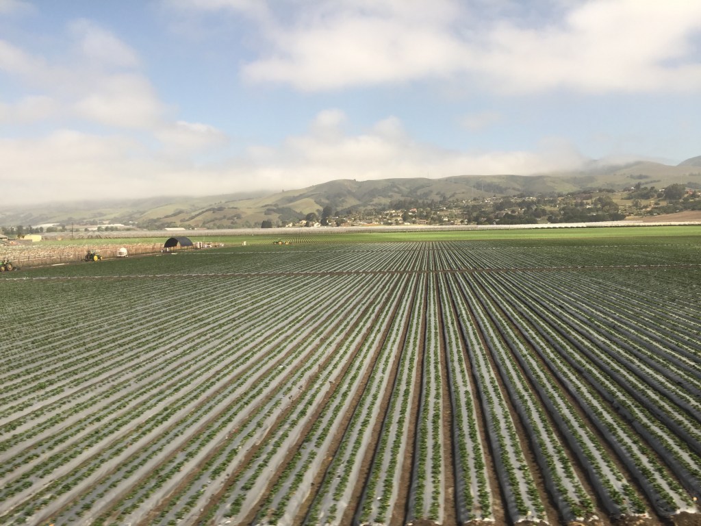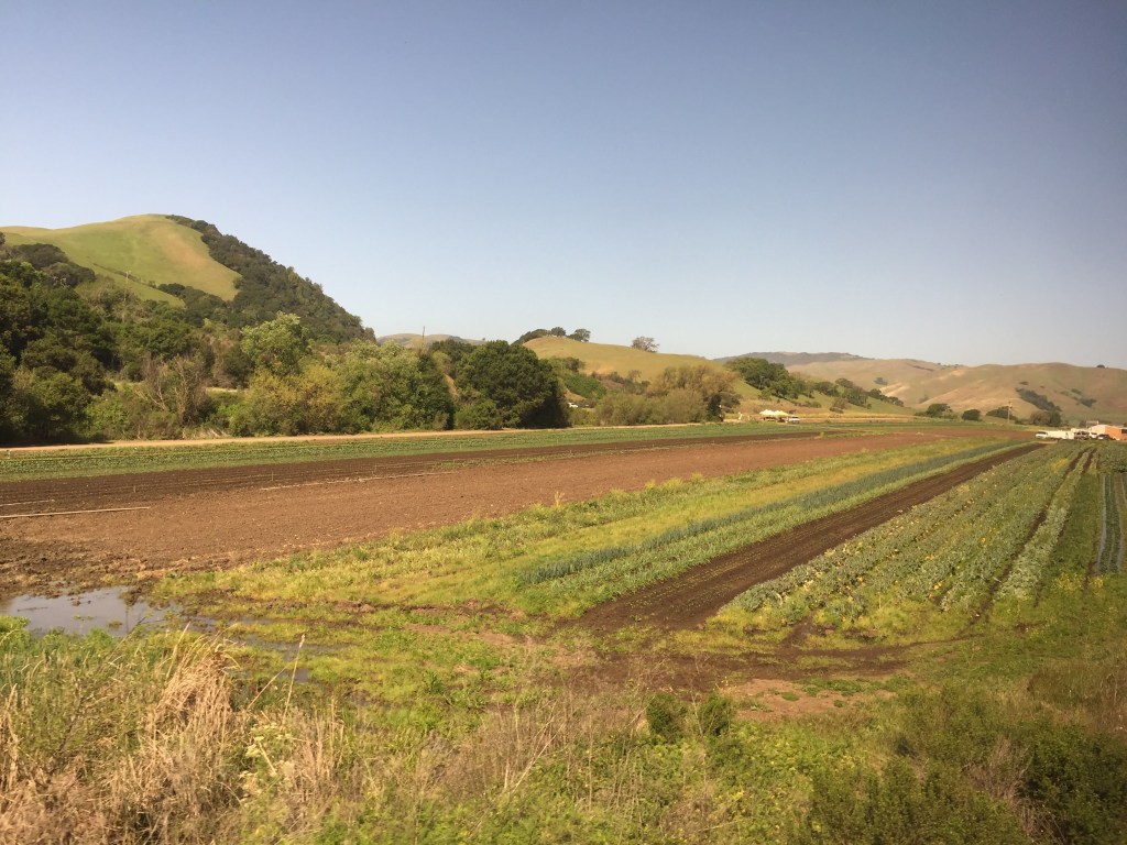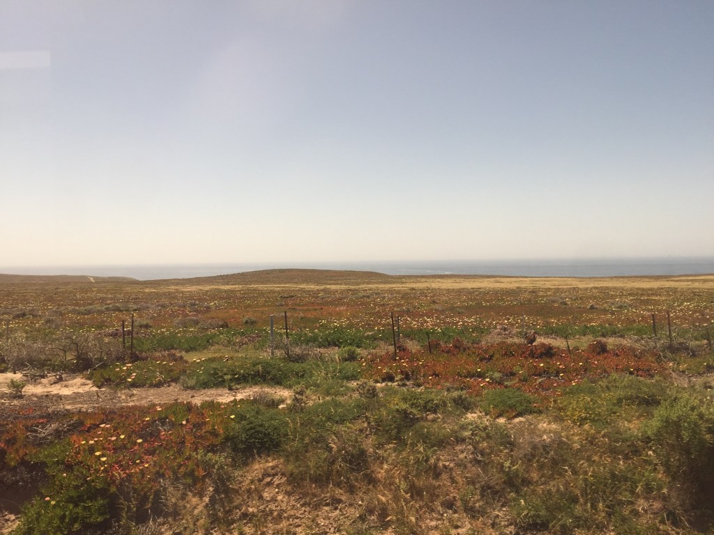 On this trip I was interested to see the old telephone wires with their glass caps to prevent electricity burning up the telephone poles. I saw a whale slowly gliding through the waves on the most beautiful stretch of coast, colored with succulents in full bloom. I saw a huge prison and tiny people. I saw artichokes growing freely with cows spread sparsely through the gentle hills.